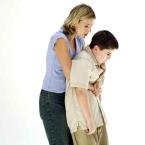 * Lean the person forward slightly and stand behind him or her. Make a fist with one hand. Put your arms around the person and grasp your fist with your other hand in the midline just below the ribs. Make a quick, hard movement inward and upward in an attempt to assist the person in coughing up the object. This maneuver should be repeated until the person is able to breathe or loses consciousness.